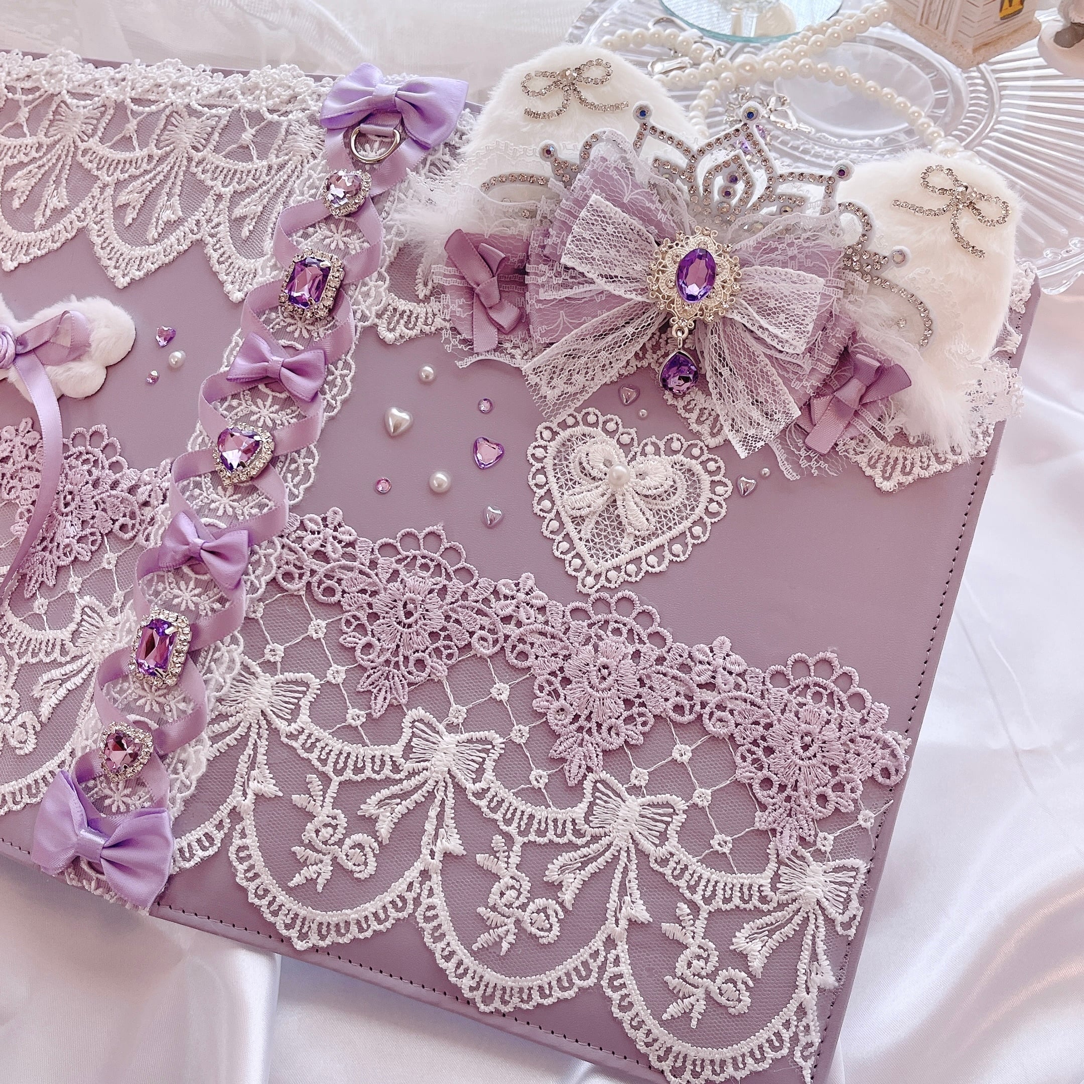 大きめの猫耳とキラキラティアラ、リボンと薔薇の繊細な刺繍を重ねてビジューパーツをたくさん使用したこだわりのバインダーデコです。
